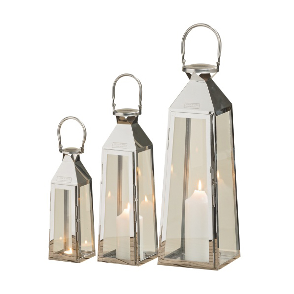 Die drei verschieden hohen Laternen/Windlichter eignen sich hervorragend zur Dekoration und können einzeln oder direkt nebeneinander aufgestellt werden. Jede Laterne verfügt über eine Glastüre um die Lichtquelle gut positionieren zu können und zudem über einen Henkel.